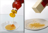 Pour small amount of honey in dish. Sprinkle small amount of honey in second dish